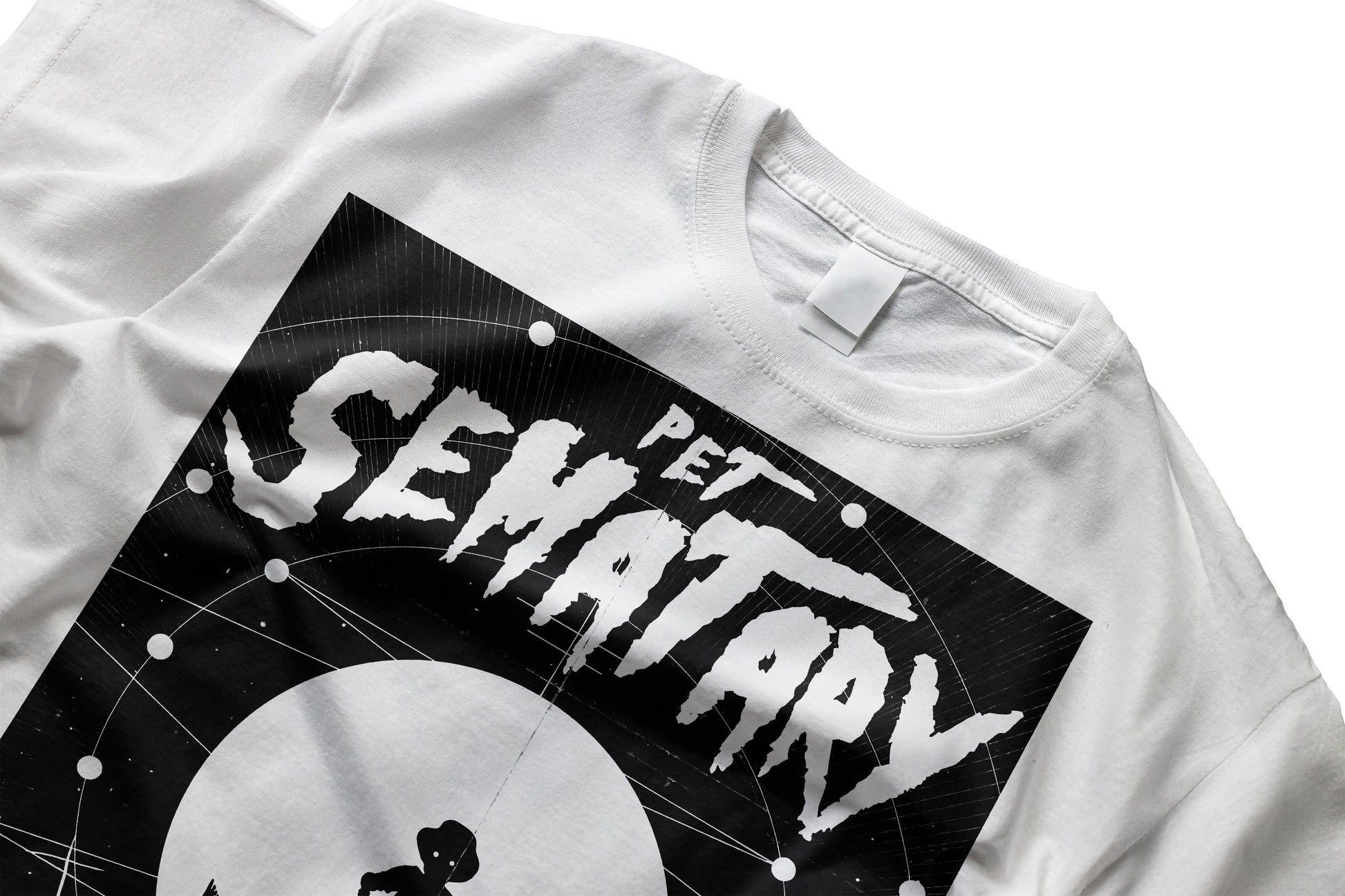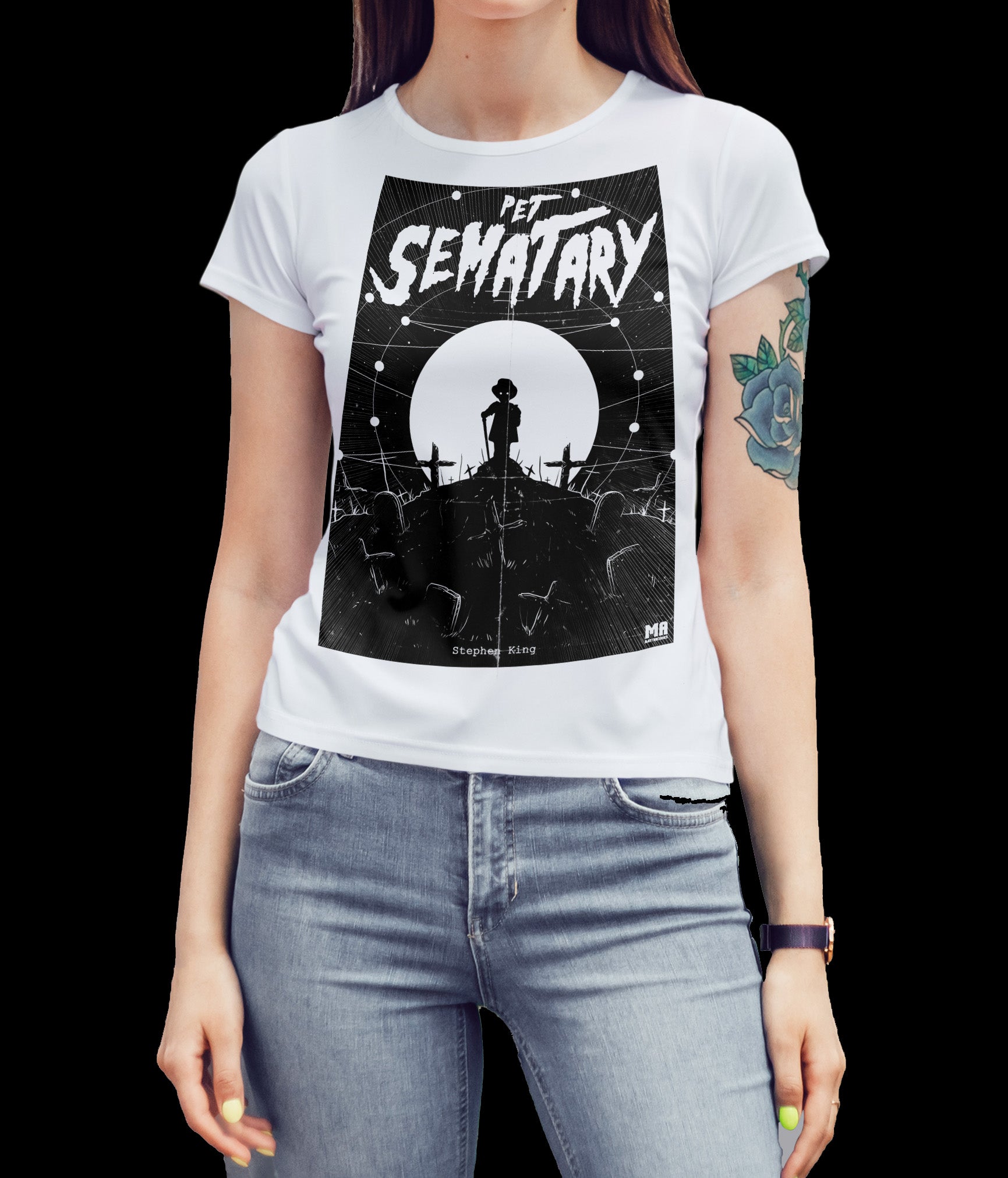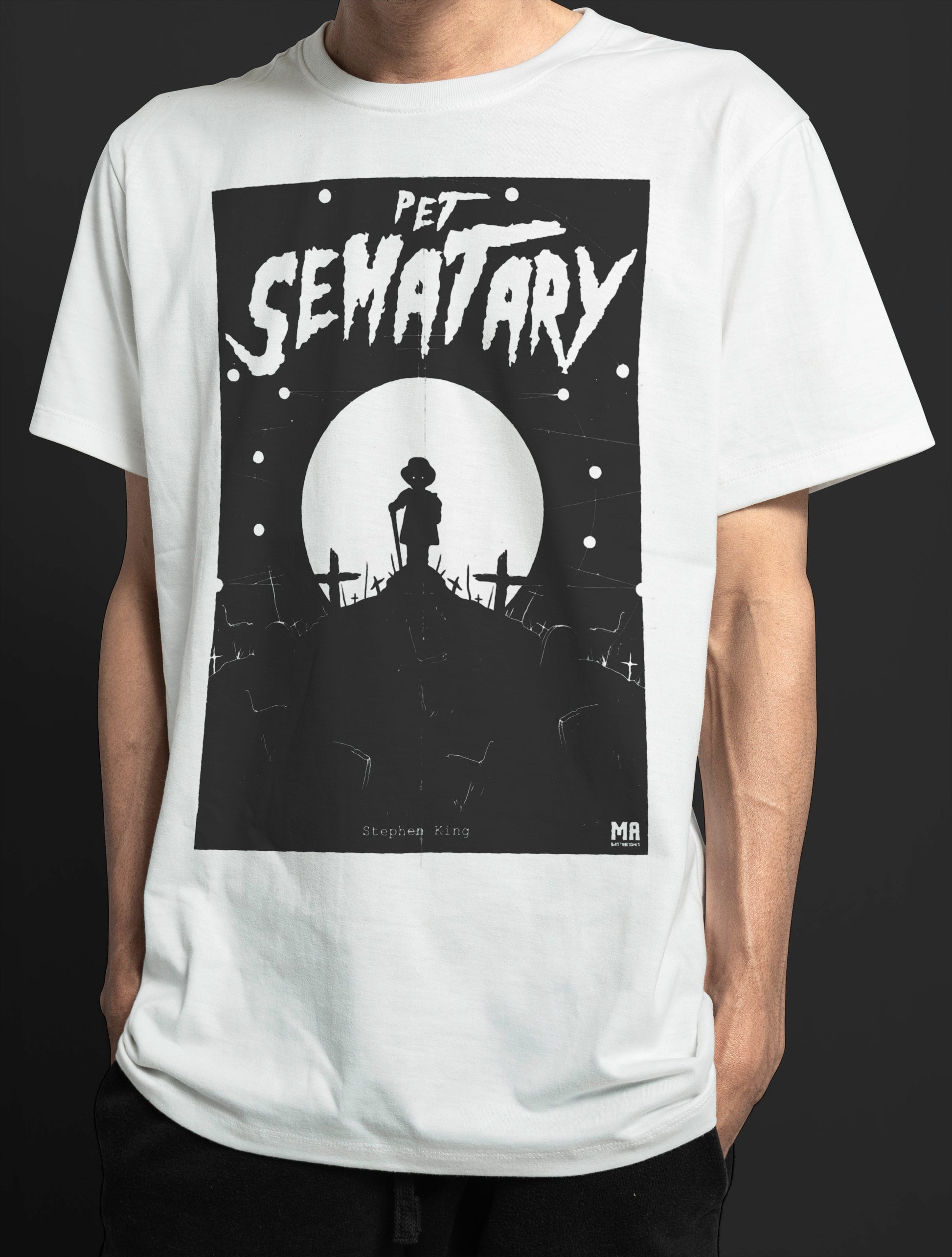 Con un diseño en blanco y negro que muestra la silueta de una figura ante la luna llena y las cruces del cementerio, esta camiseta captura la esencia del horror psicológico y la tragedia del clásico de King.