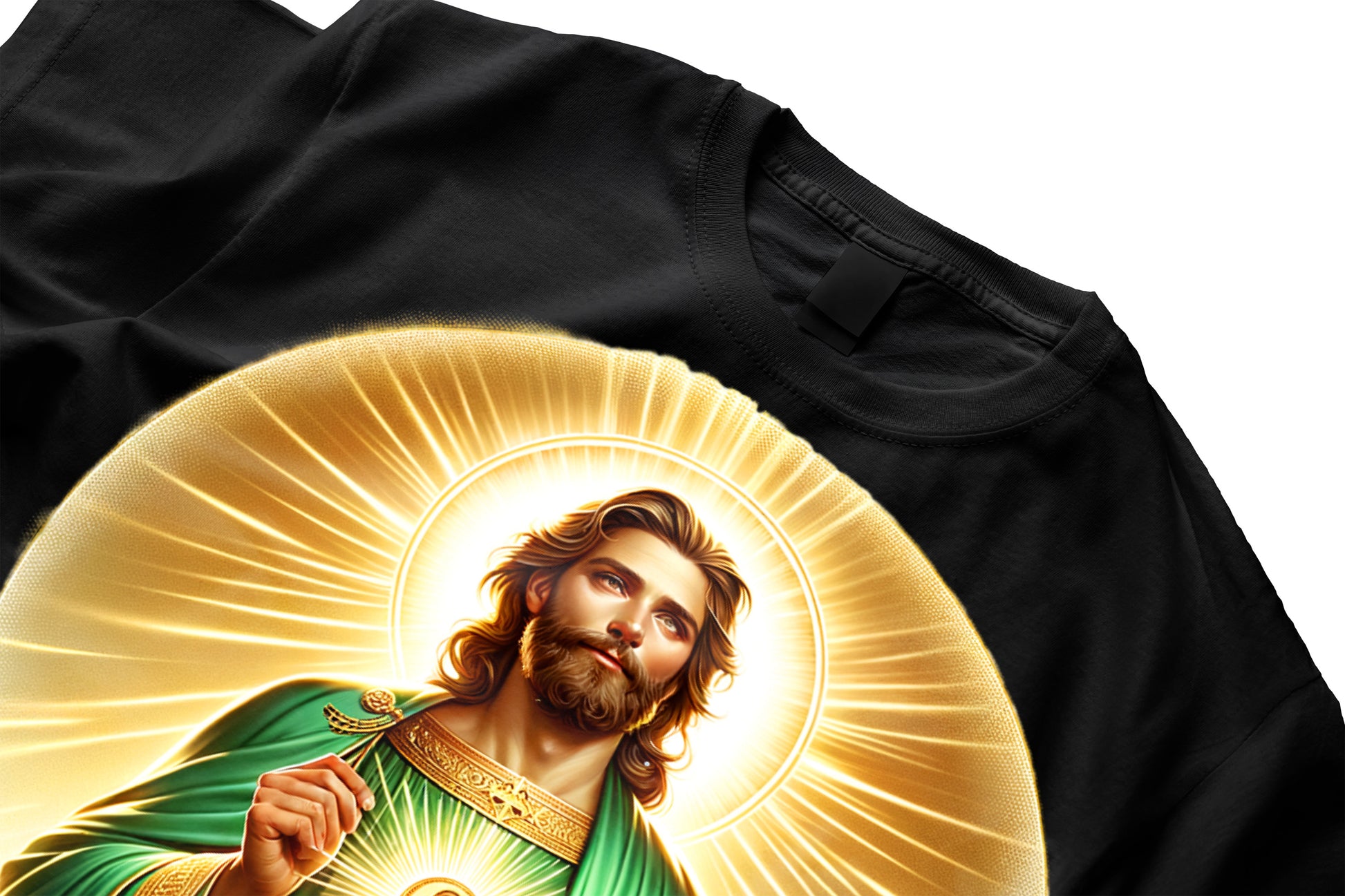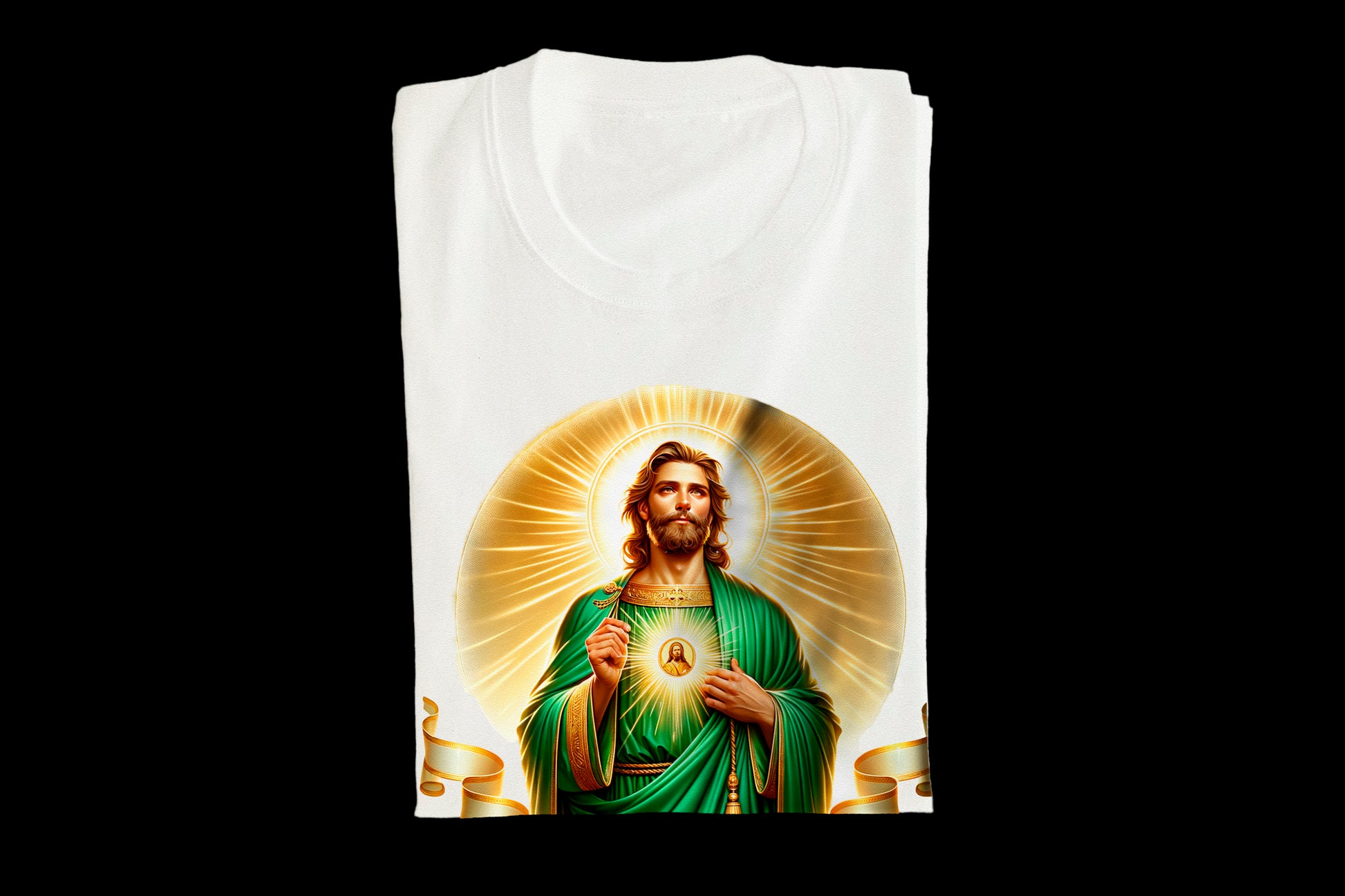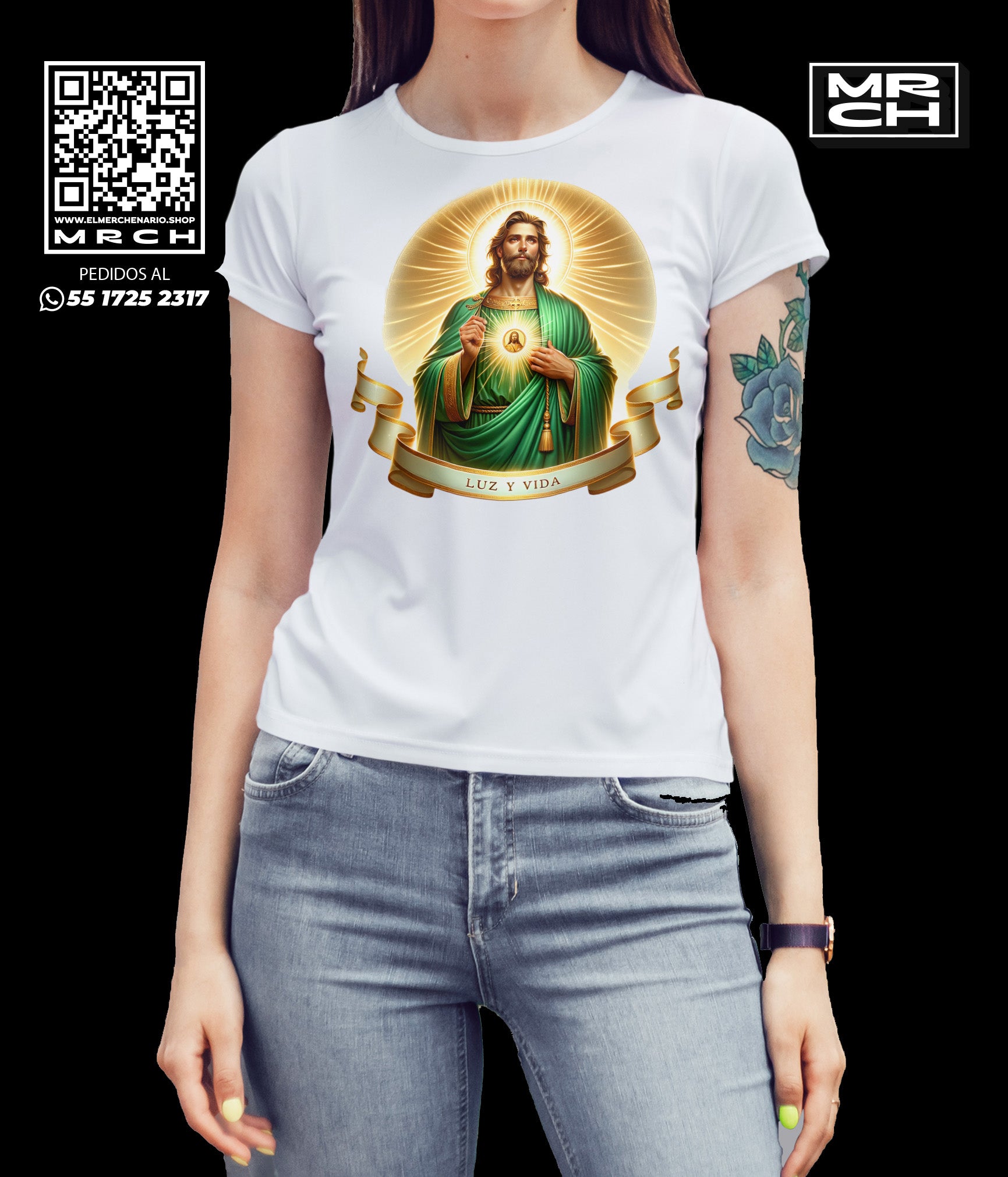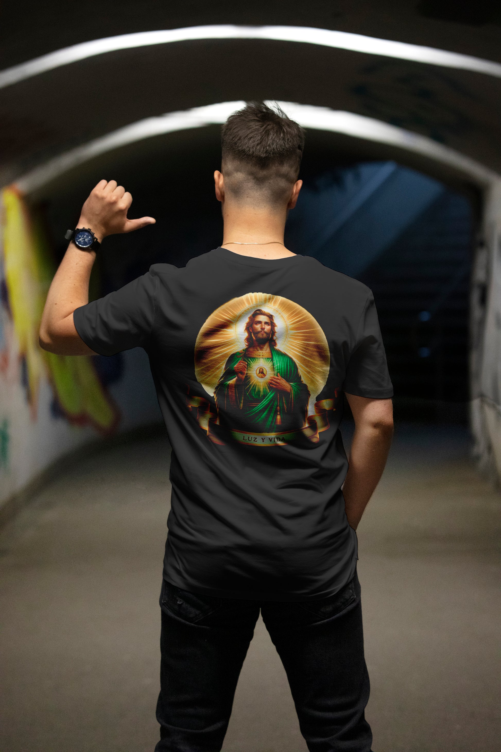 Irradia energía positiva con la playera “Luz y Vida”, un diseño que combina arte sacro y estética moderna. Con tonos dorados, verdes y resplandor celestial, esta ilustración representa la esperanza, la guía espiritual y la renovación interior.