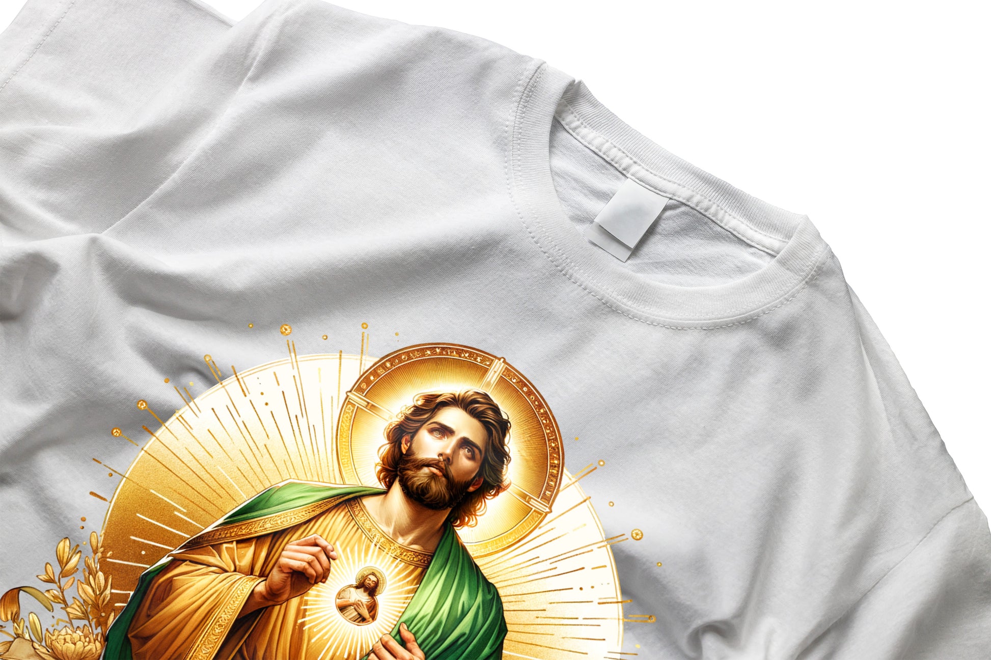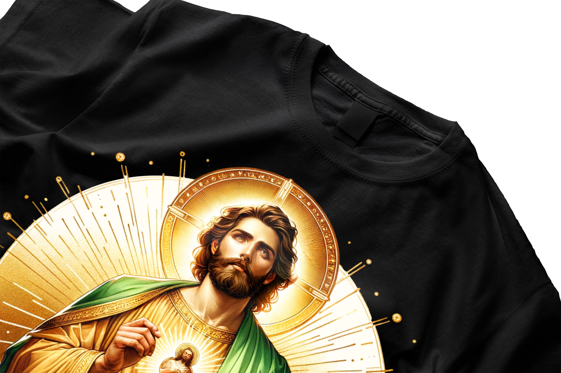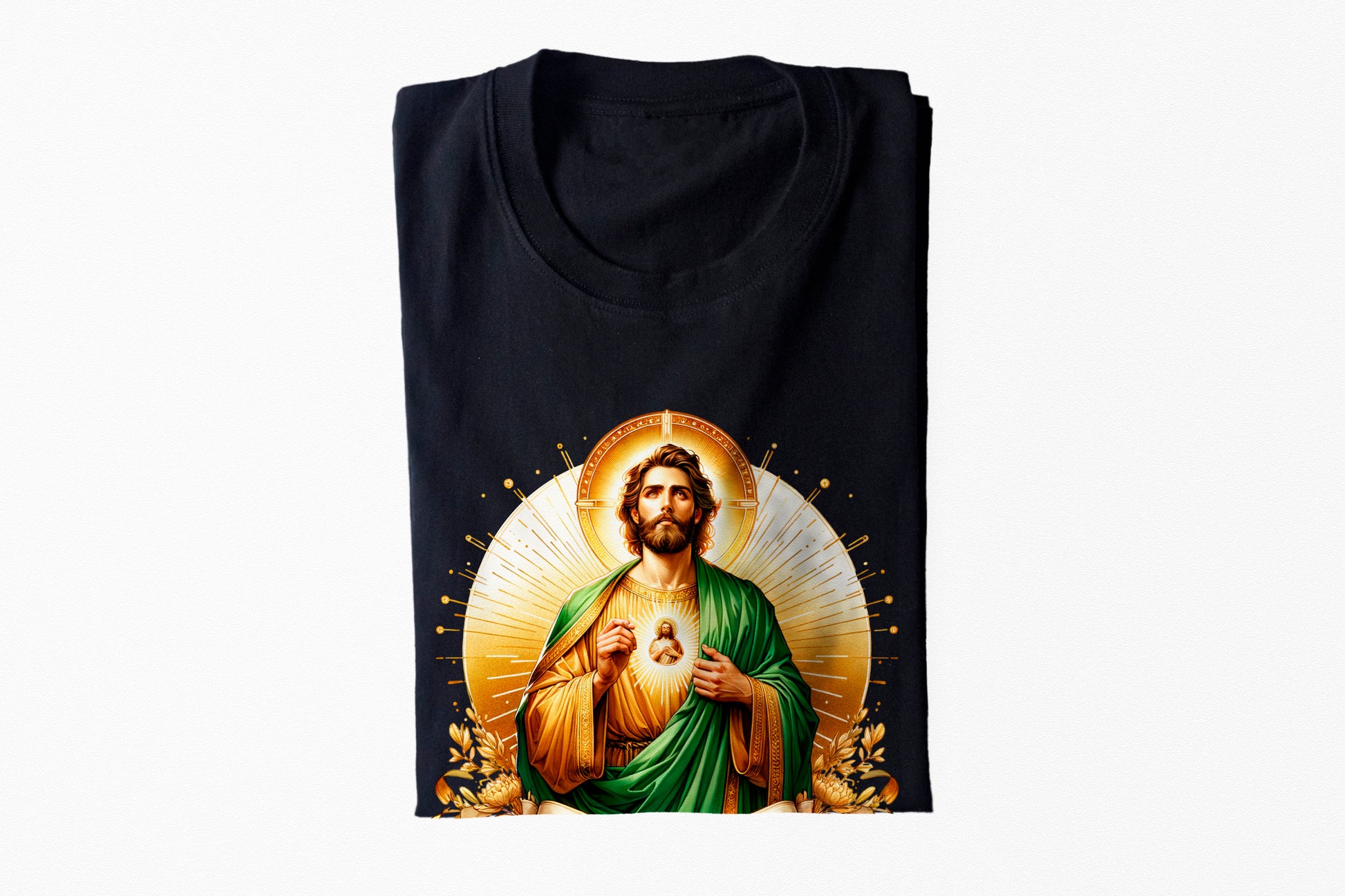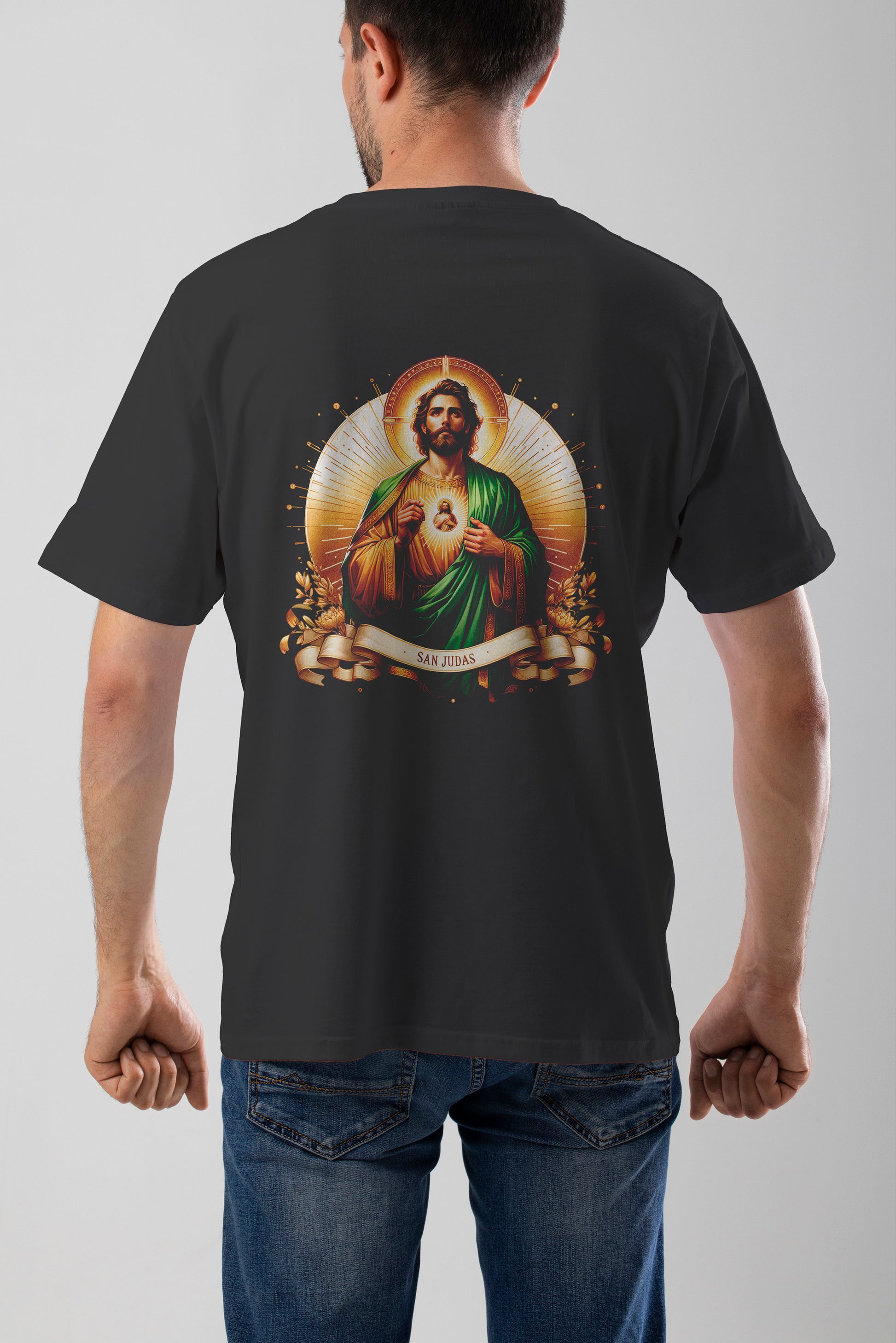 Rinde homenaje al símbolo de la fe y la fortaleza con la playera “San Judas – Luz y Esperanza”. Su diseño vibrante en tonos dorado, verde y ámbar refleja devoción, esperanza y protección espiritual. La ilustración muestra una figura luminosa rodeada de destellos dorados y una cinta con el nombre “San Judas”, enmarcada con elegancia y detalle artístico.