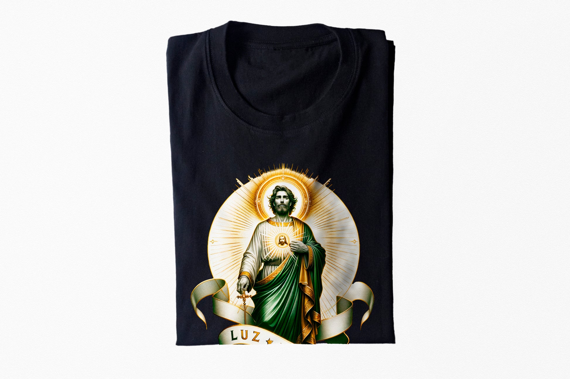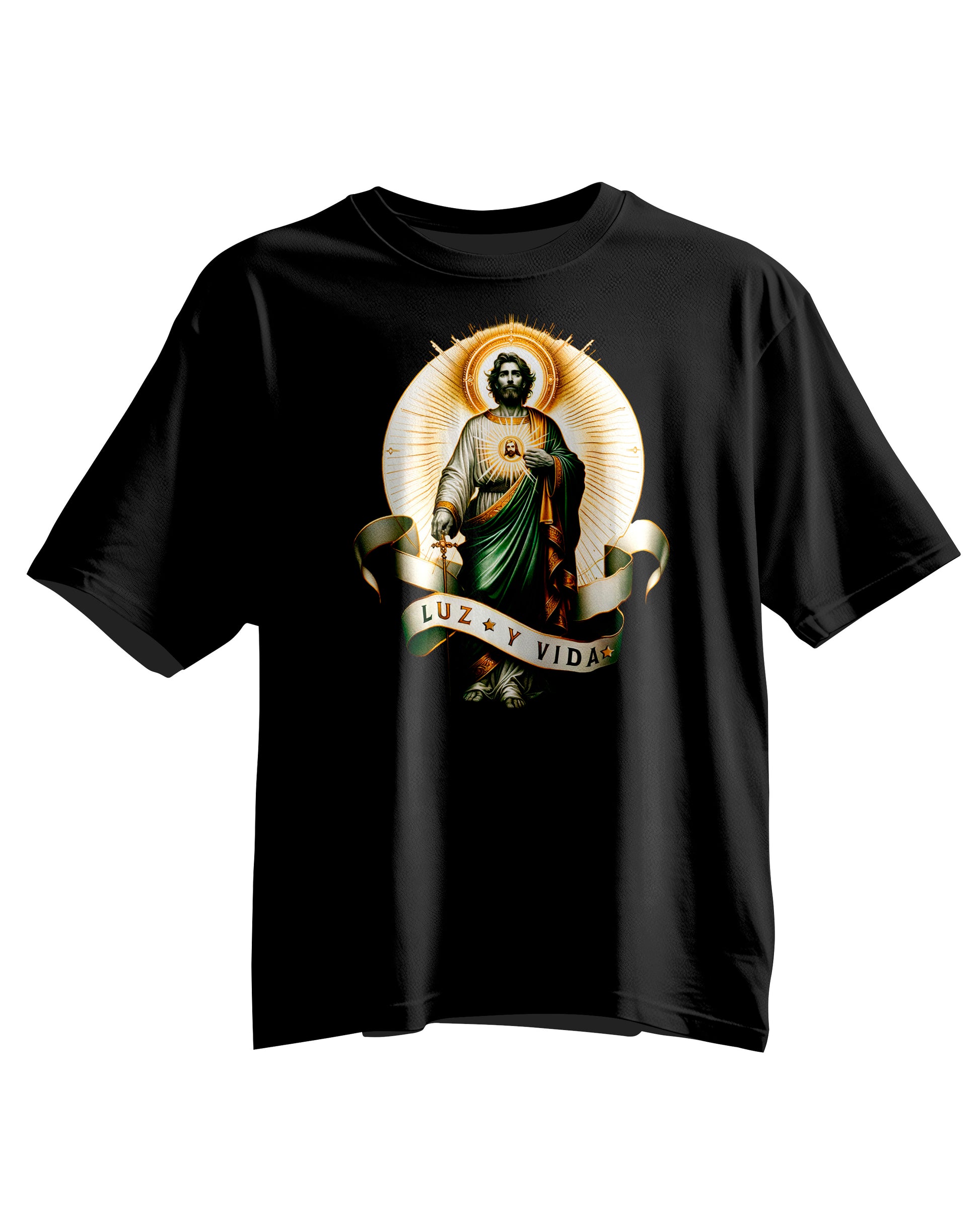 La playera “Luz y Vida VI” cierra con esplendor la serie de arte devocional moderno. Su composición central resalta una figura envuelta en un halo dorado radiante sobre un fondo verde profundo, símbolo de renovación, protección y guía espiritual. La cinta inferior con la frase “Luz y Vida” refuerza el mensaje de esperanza y propósito interior.