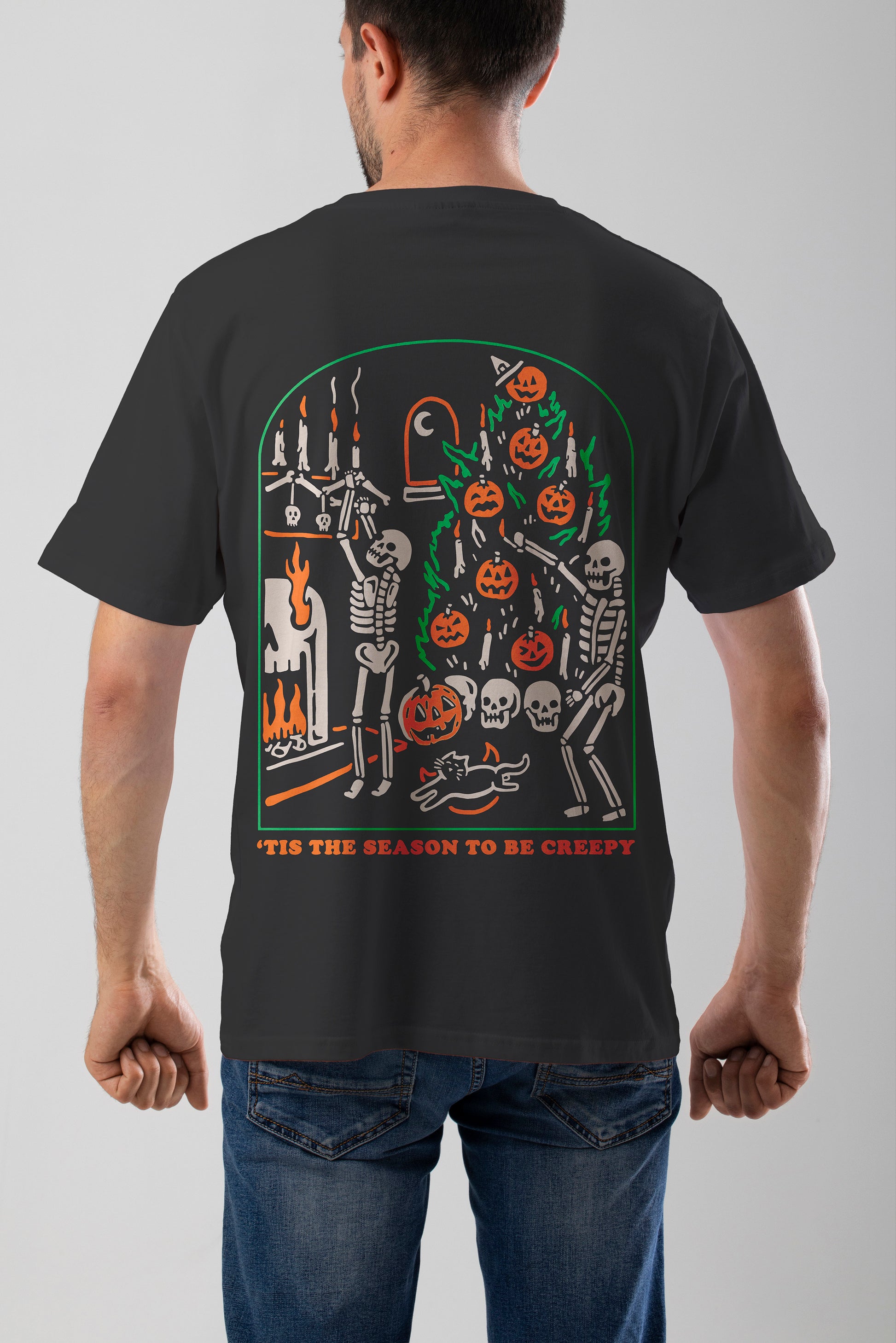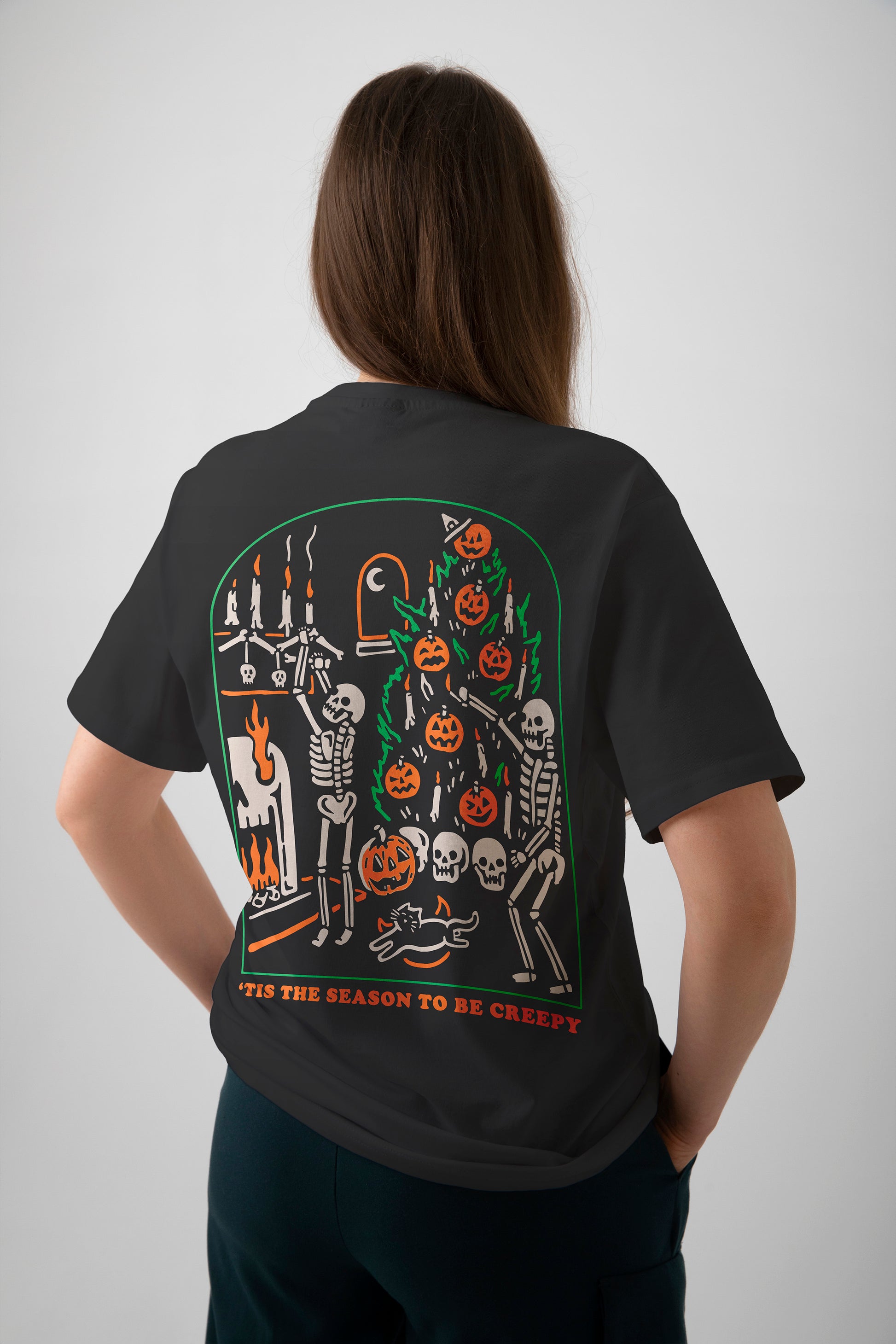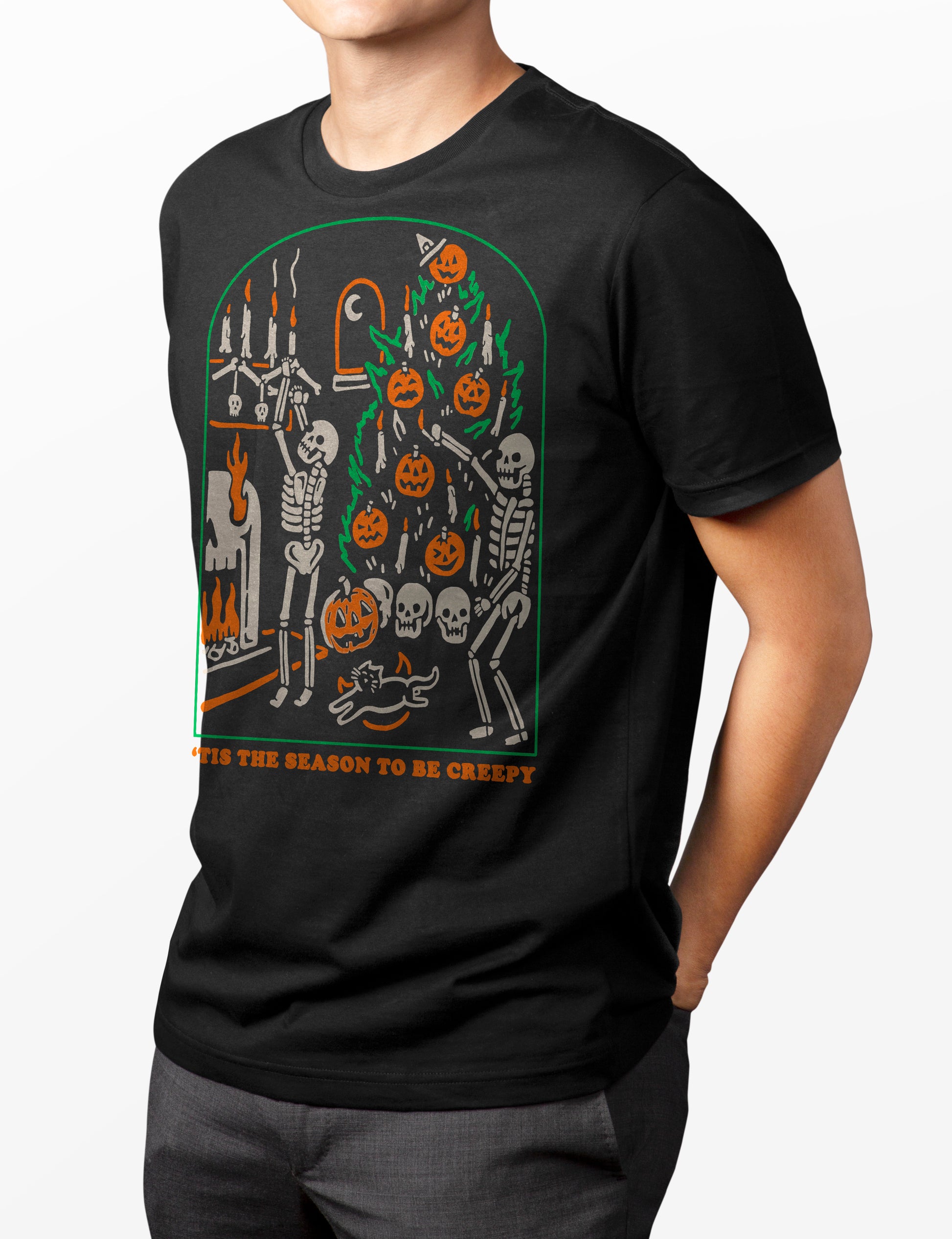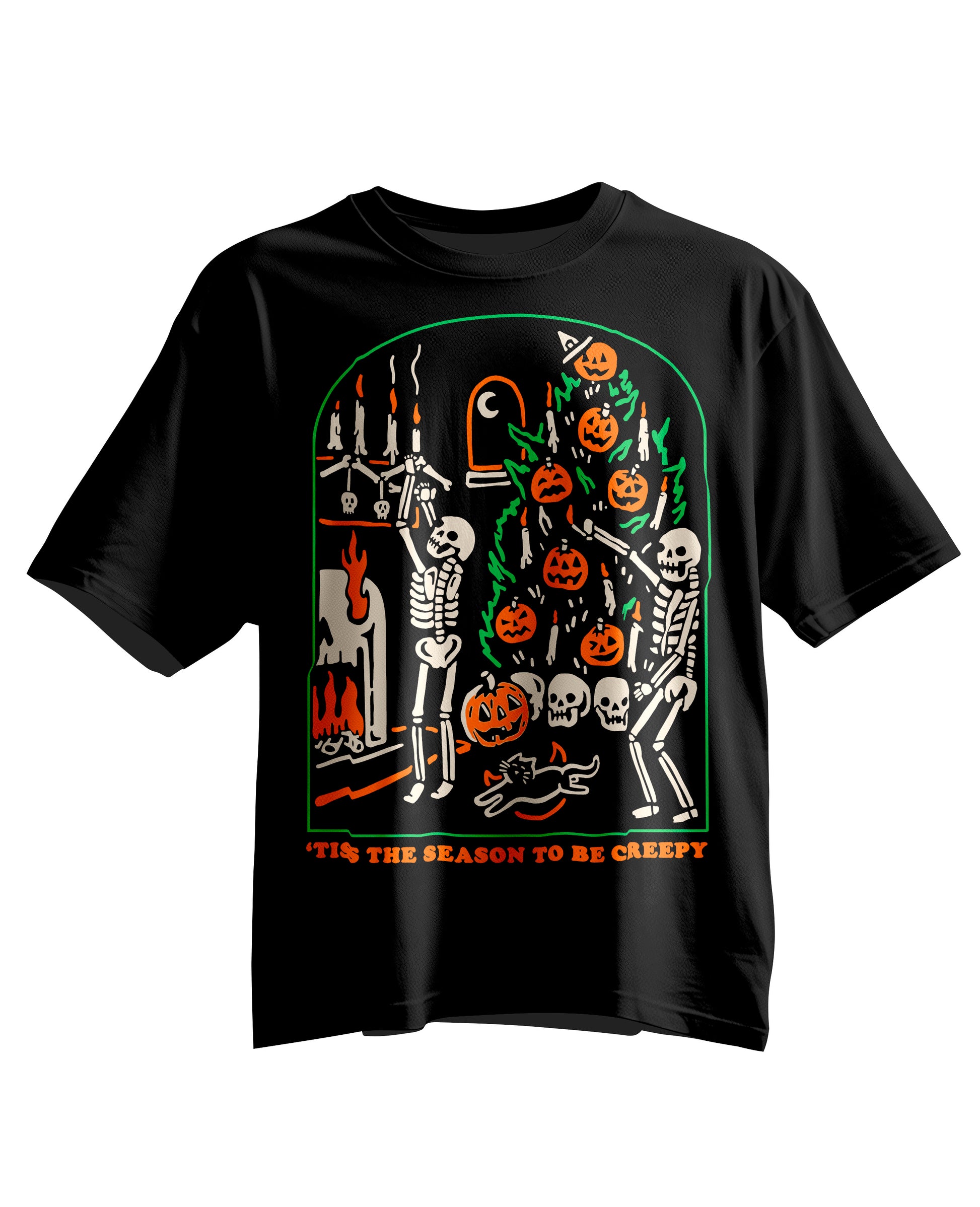 La playera “‘The Season to Be Creepy” celebra la fusión perfecta entre Halloween y el espíritu navideño con un toque macabro. Dos esqueletos decoran un árbol lleno de calabazas, calaveras y velas en una escena tan espeluznante como festiva.