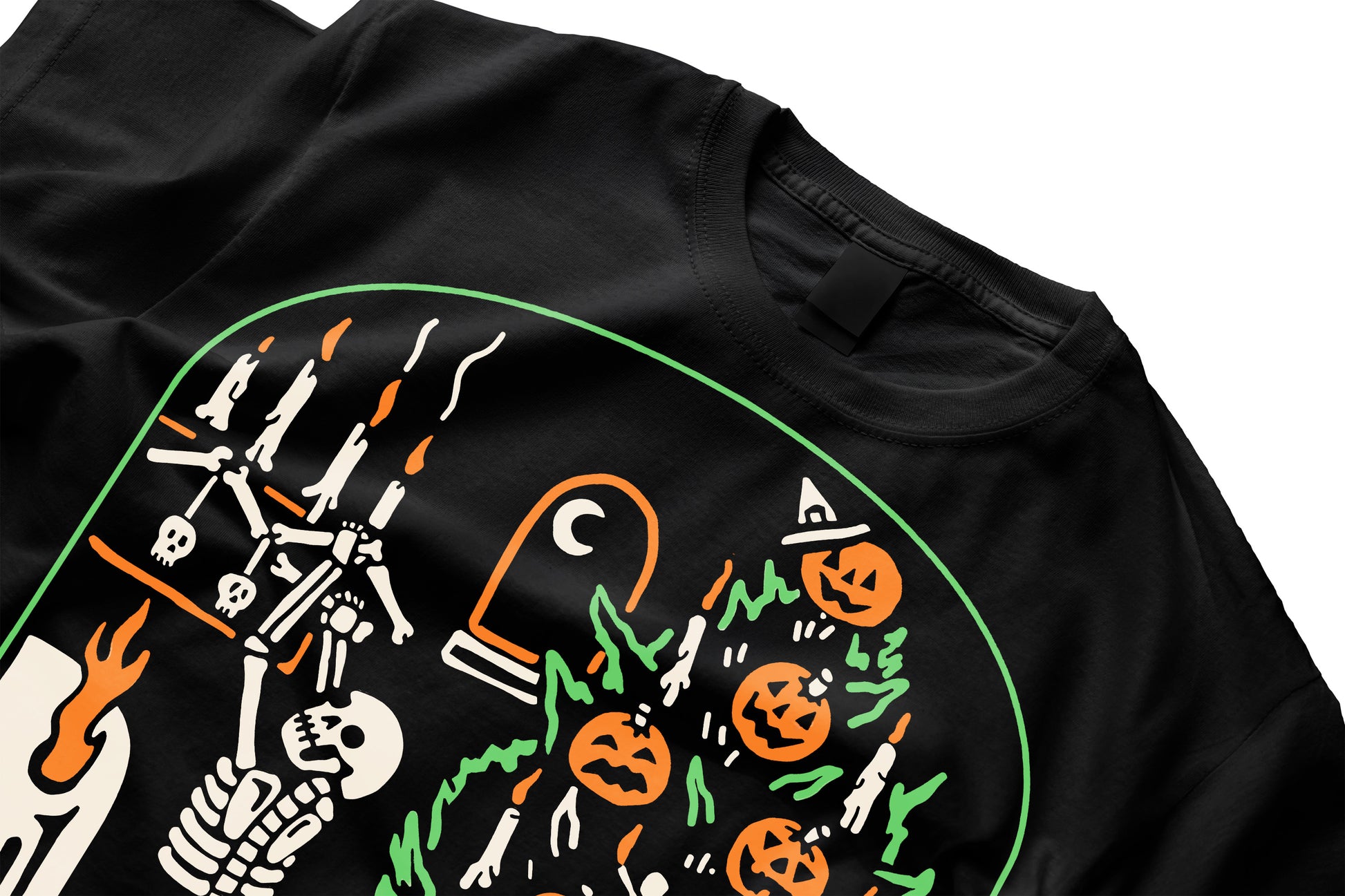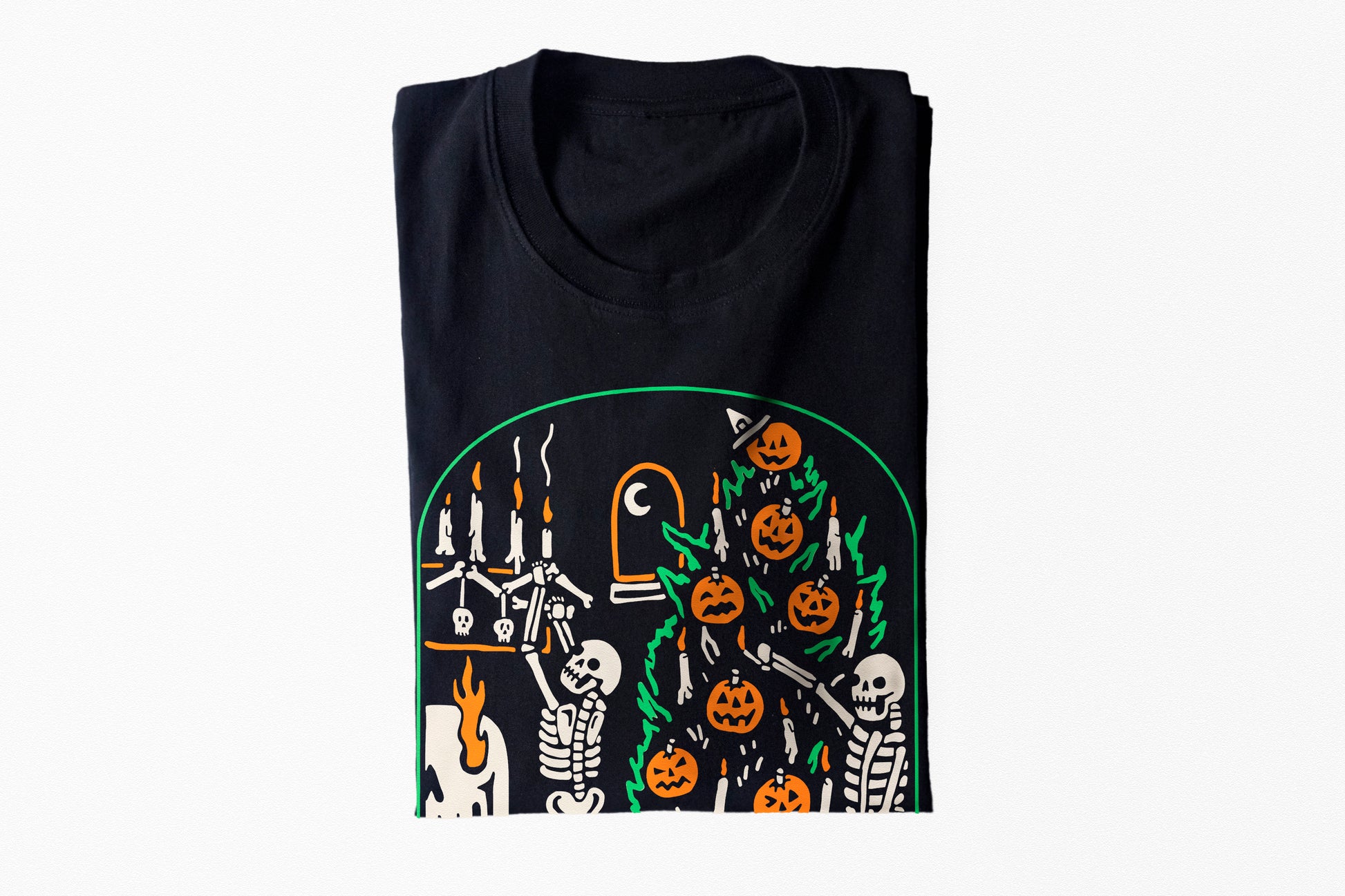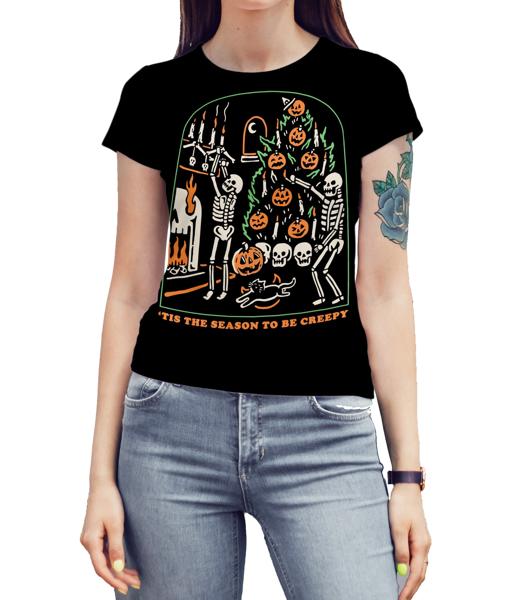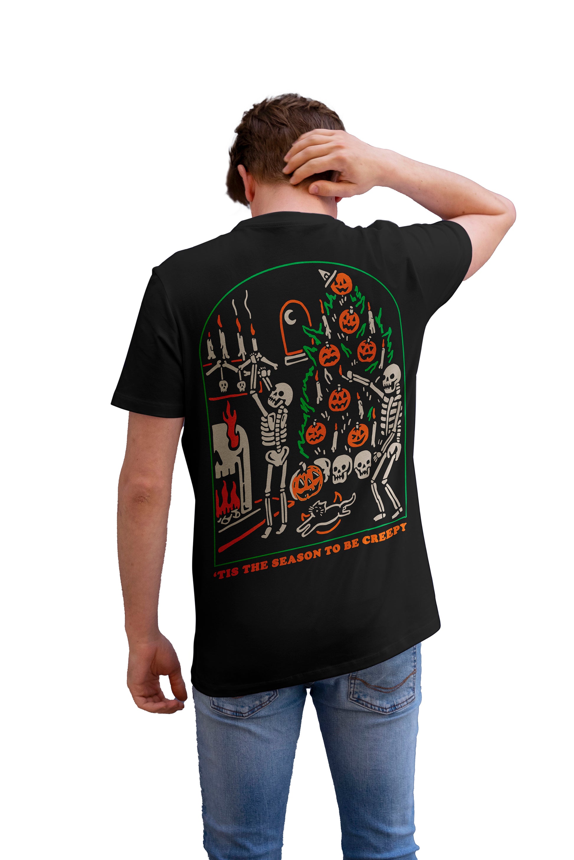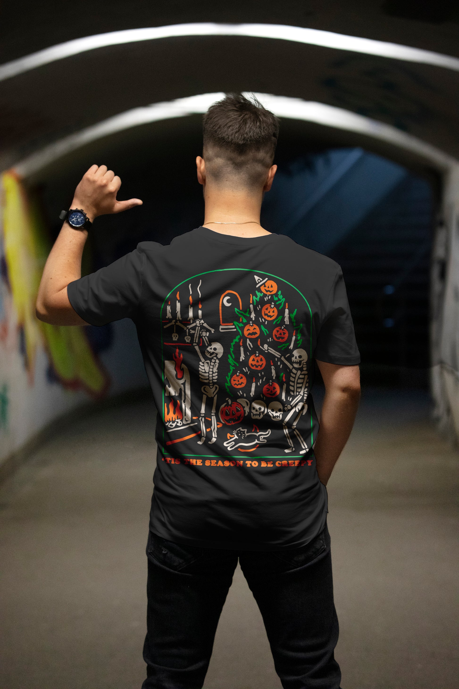 La playera “‘The Season to Be Creepy” celebra la fusión perfecta entre Halloween y el espíritu navideño con un toque macabro. Dos esqueletos decoran un árbol lleno de calabazas, calaveras y velas en una escena tan espeluznante como festiva.