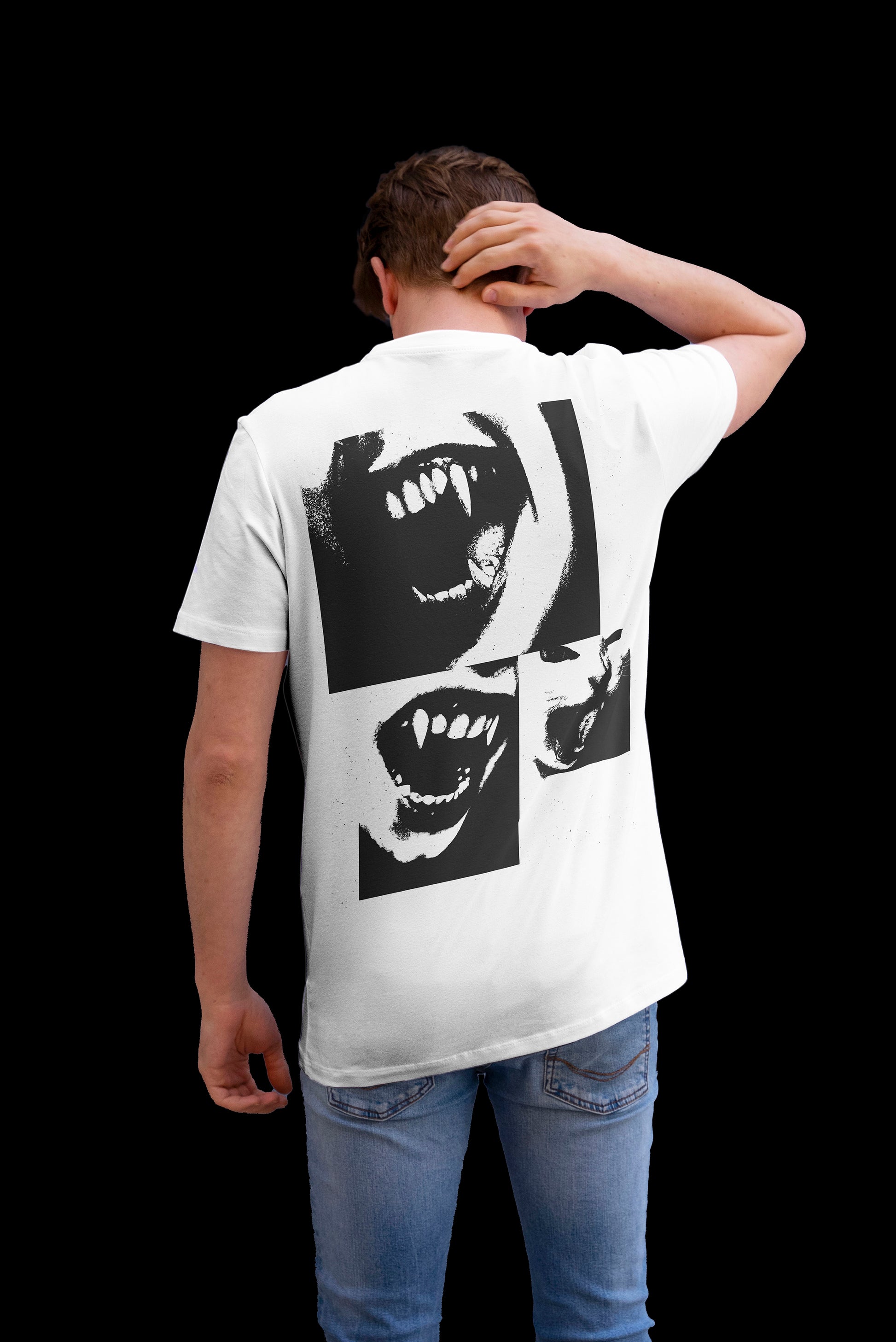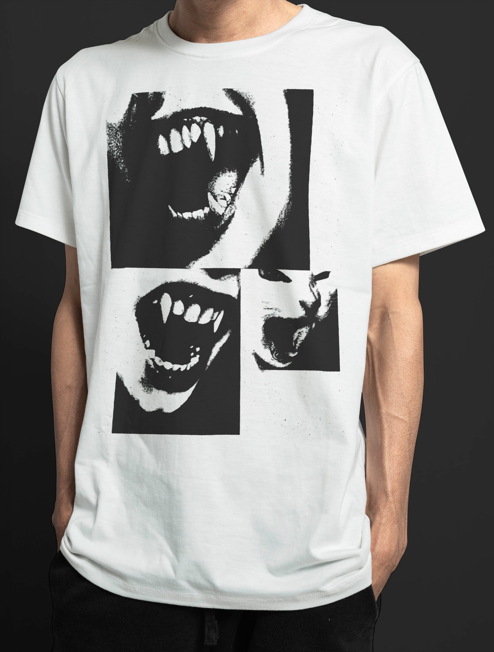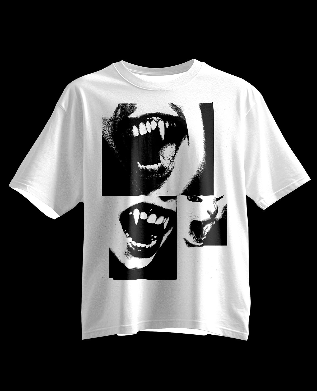 Camiseta blanca con un diseño impactante que presenta rostros gritando y un gato, ideal para los amantes del arte gráfico y la moda alternativa.